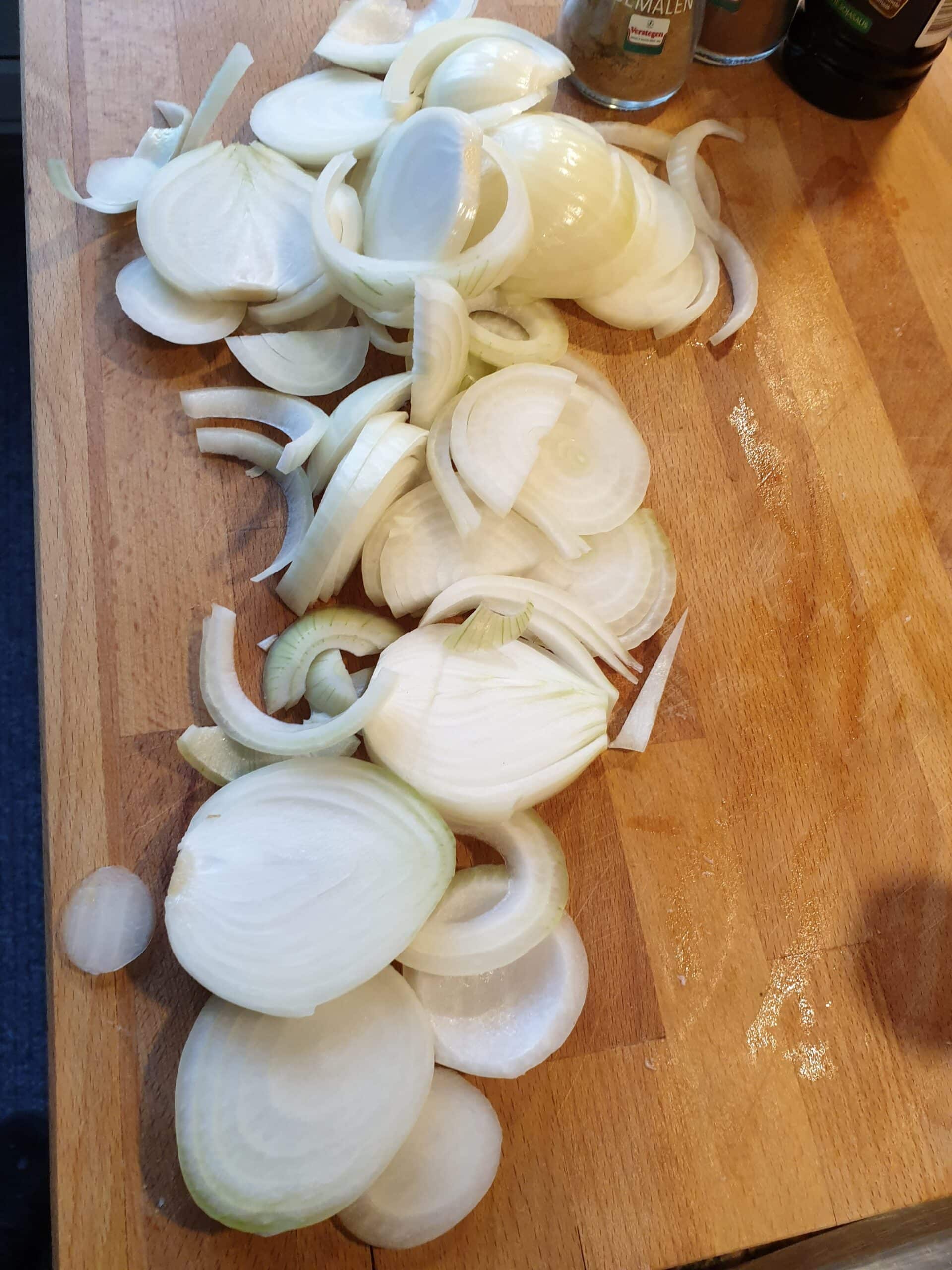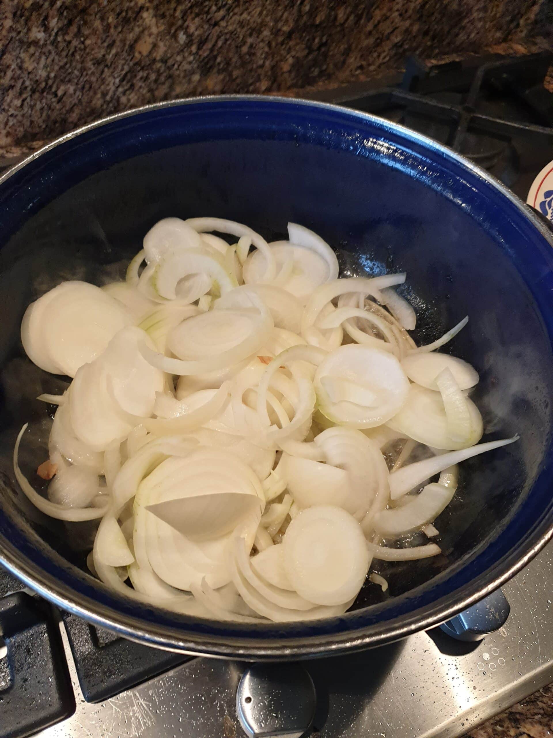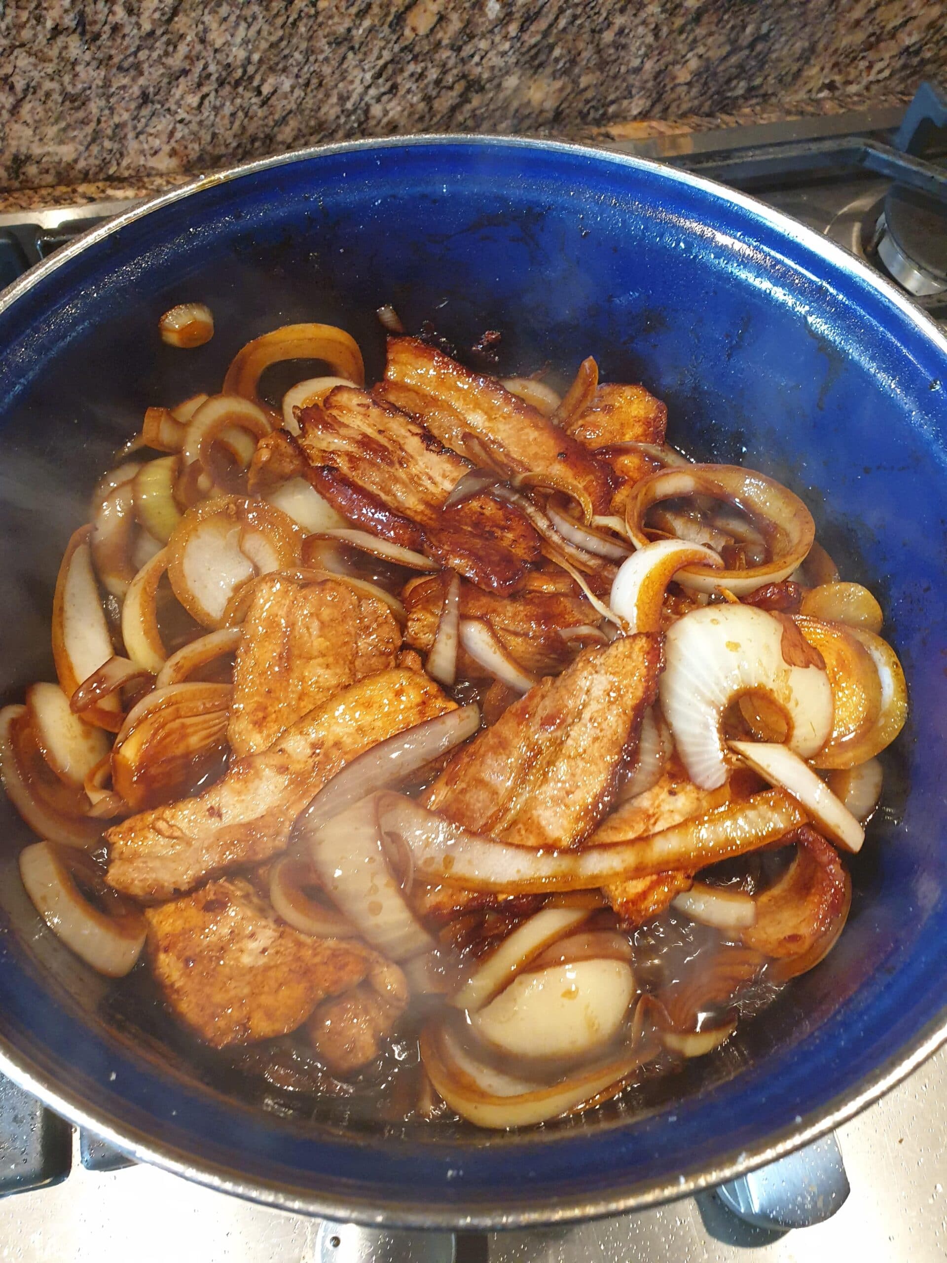 doe de uien in de pan gember en de gekruste knoflook en de knoflook poeder