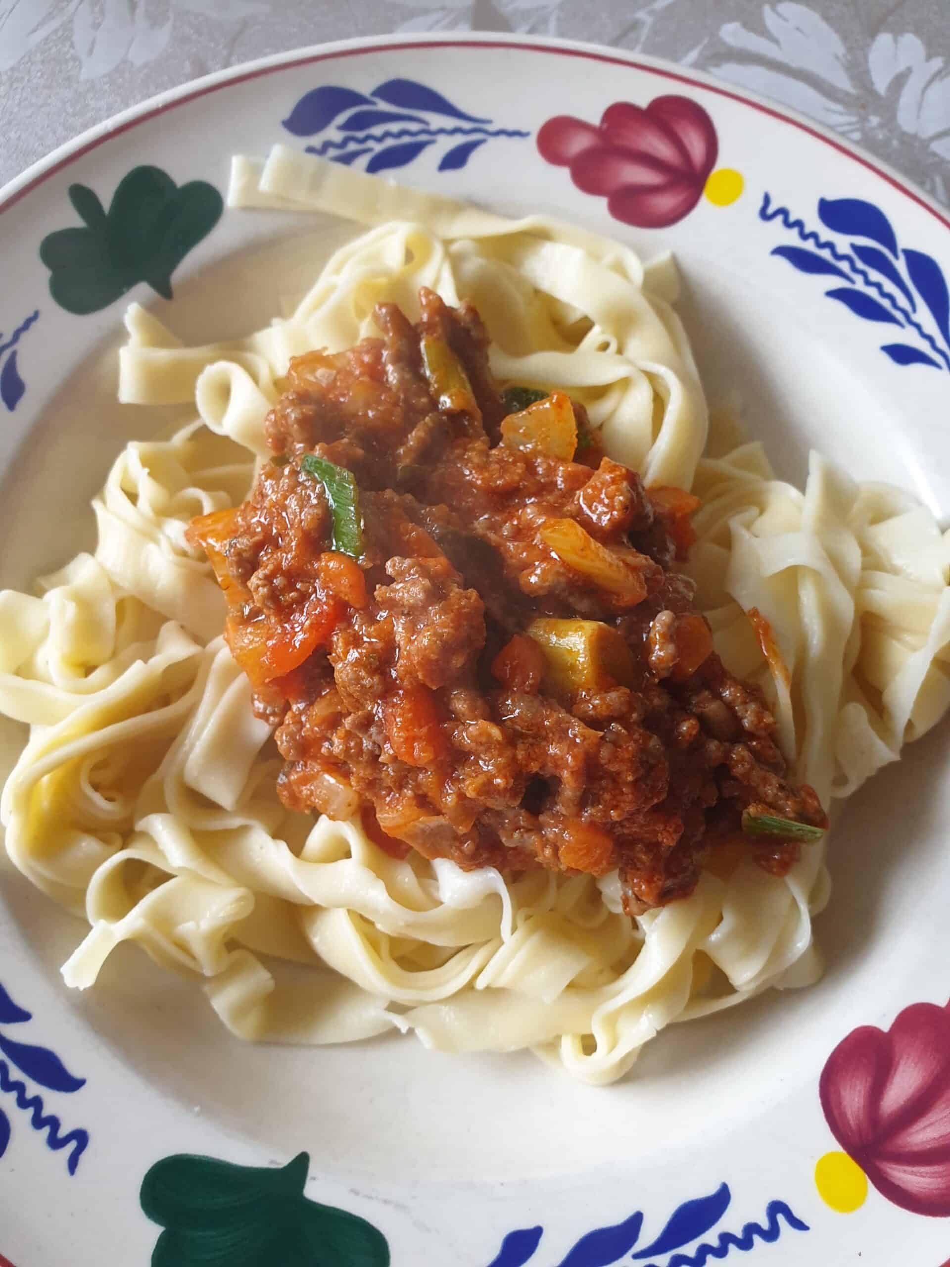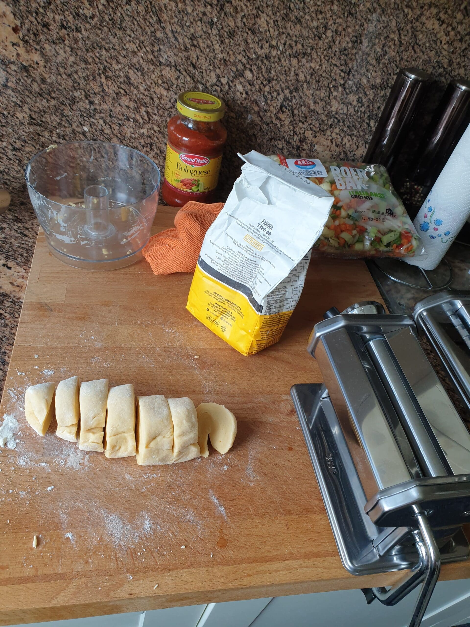 Neem 200 gram pasta bloem en 2 eieren , (altijd 1 ei per 100 gram bloem)doe dit in een grote pan en ga de deeg kneden goed kneden met de bolling van je handpalmvouw het een paar keer dubbel om voldoende lucht erin te krijgen. laat de deeg even rusten 10 minuten maak er een rol van en snijd deze in schijven. leg de uitgedraaide past op een bord